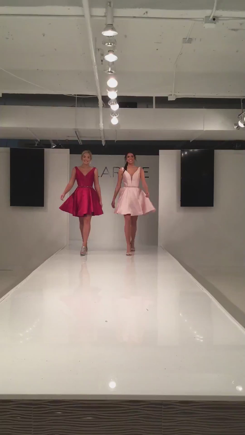 Clarisse s7019 is an A-line short formal dress with plunging neckline, beaded belt, side pockets, lace up back, and mikado skirt.