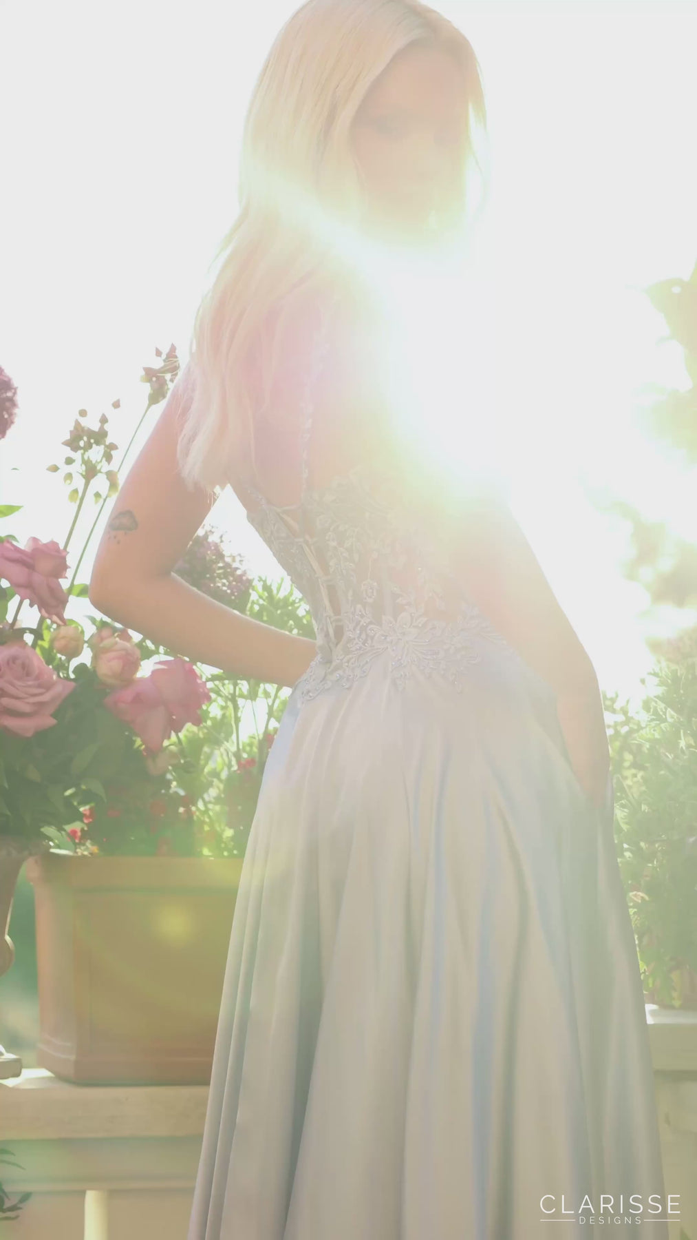 Flirt with elegance in this playful gown featuring a stunning lace bodice and a sheer midriff that adds a touch of daring charm. The A-line silky satin skirt flows gracefully with a side slit, making every move effortlessly captivating.