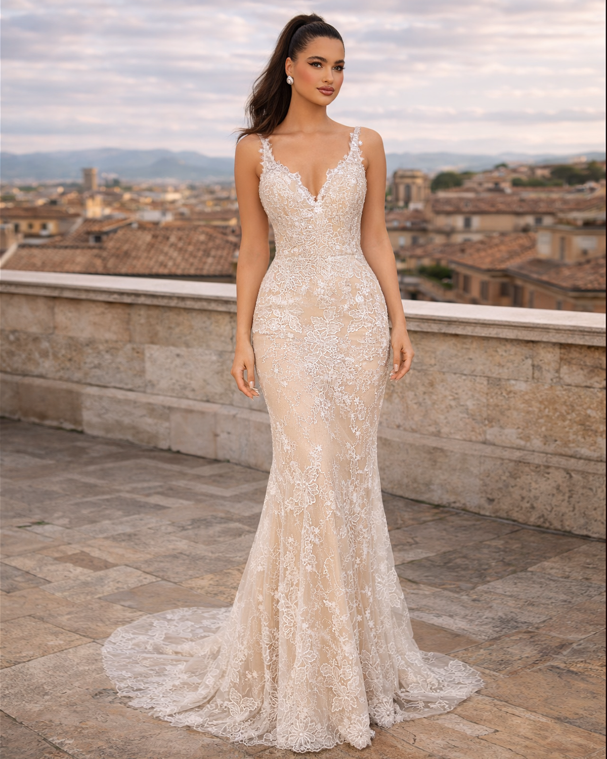 Elegant fit and flare wedding dress crafted in delicate lace, featuring a flattering v-neckline and intricate lace straps. The open back design adds a touch of romance and sophistication, while the graceful small train completes the timeless silhouette. Perfect for the modern bride seeking classic elegance with contemporary details.