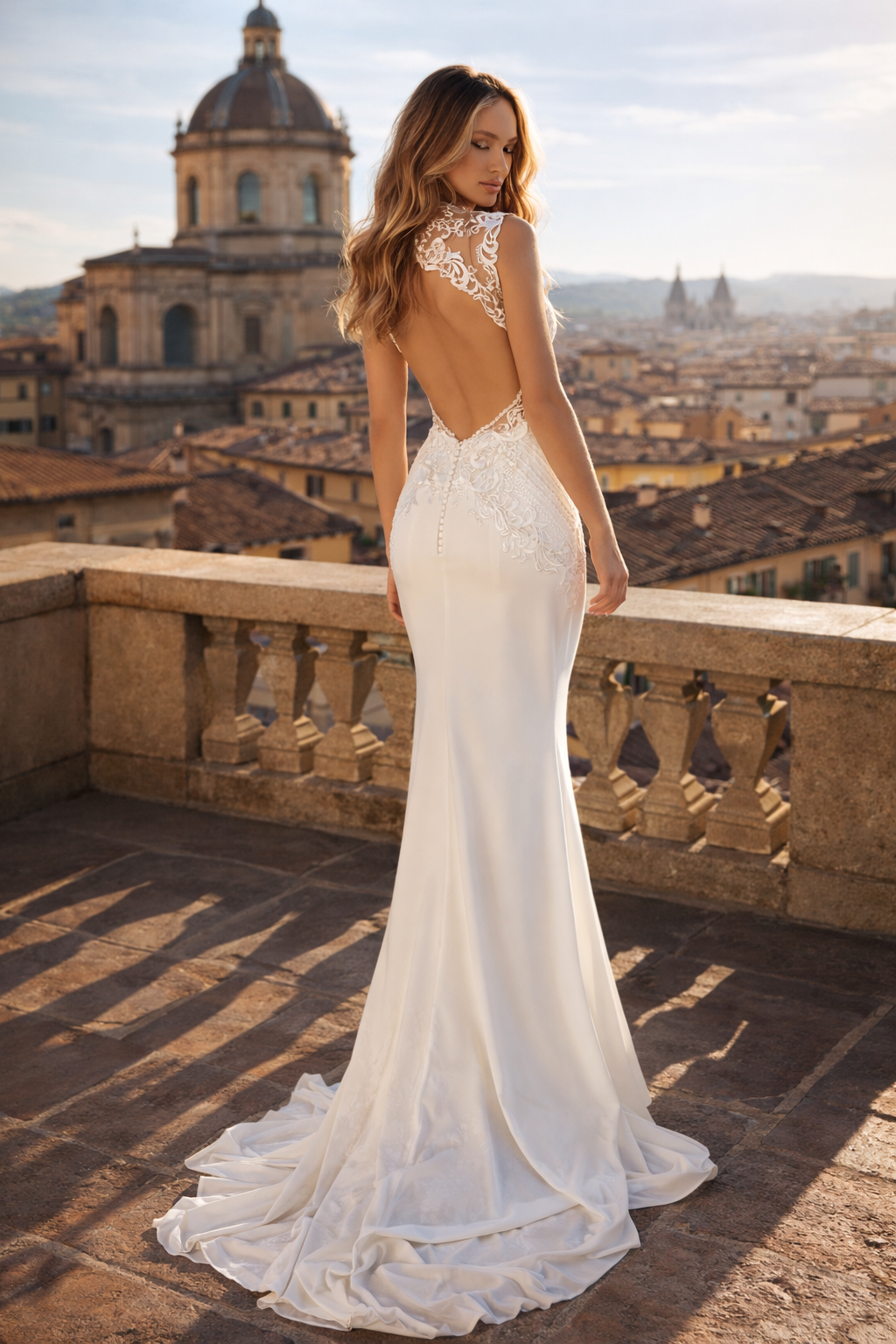 Elegant fit and flare bridal gown that combines timeless romance with modern sophistication. The delicate lace appliqué adorns the bodice and bust, creating intricate detail and dimension. A flattering V-neckline frames the décolletage beautifully, while the keyhole open back adds an unexpected touch of allure. A graceful train completes the silhouette, perfect for a memorable walk down the aisle.
